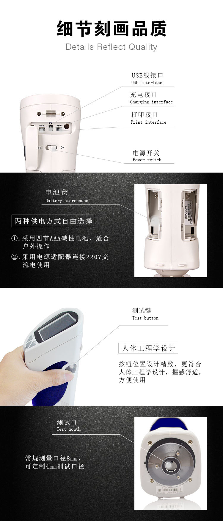 儀器內(nèi)置日本的傳感器,美G的信息處理芯片;保證了光信號的準確傳輸和電信號的穩(wěn)定,為儀器的精度和重復性保駕護航,顯示精度0.01,重復精度△E標準偏差值0.08。
