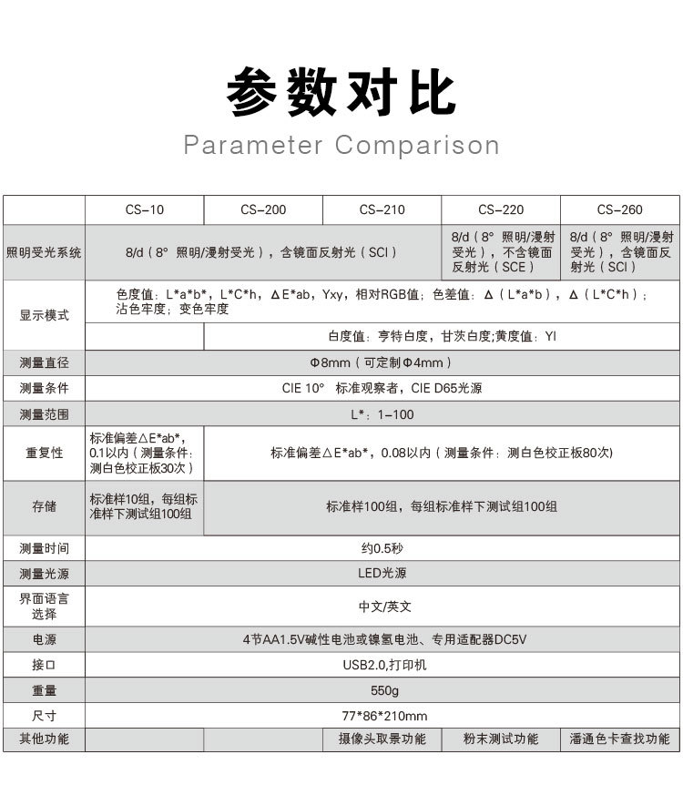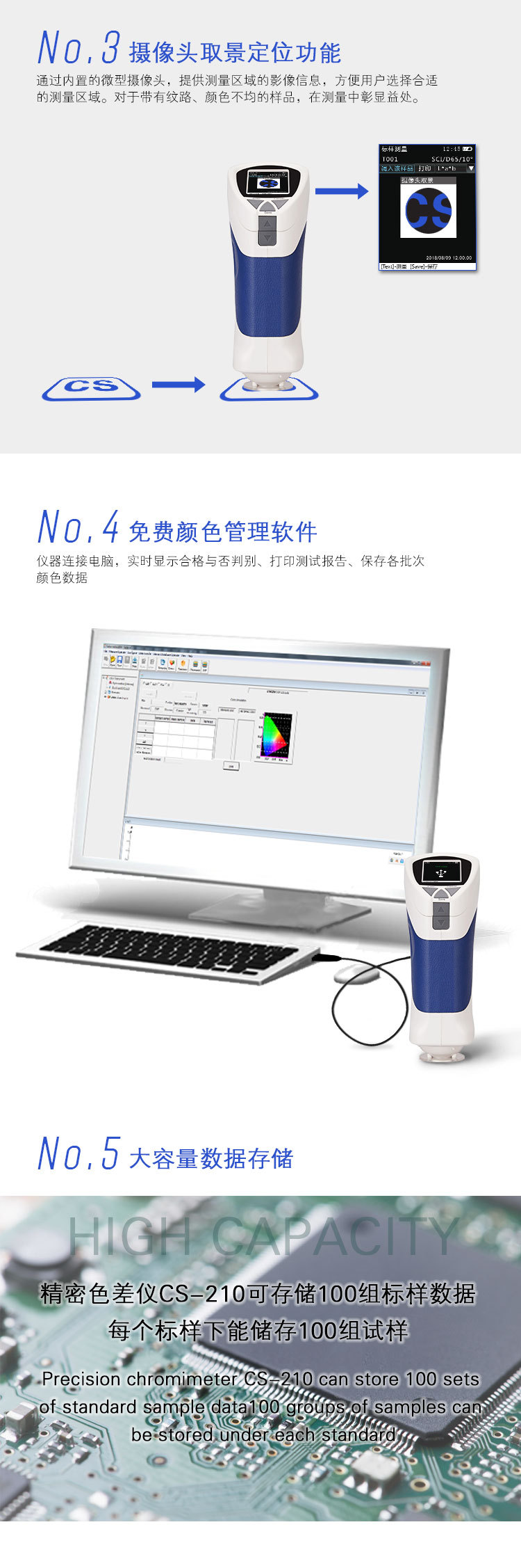 CS-210精密色差儀,廣泛應用于塑膠、印刷、油漆油墨、紡織、印染服裝等行業(yè)的顏色管理*域,根據(jù)CIE色空間測量樣品色值L*a*b、L*c*h,與被測樣品的色差△E以及 △Lab值。