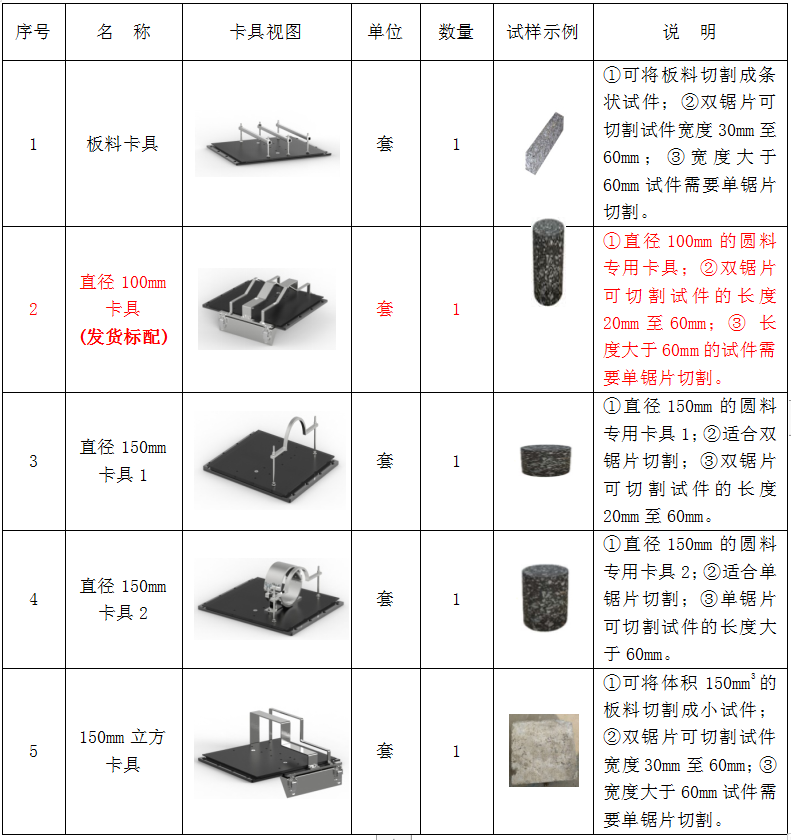 特別說(shuō)明:序號(hào)3、4的試件切割卡具和鋸片切割墊塊為本儀器出廠標(biāo)準(zhǔn)配件,用戶的特殊需求試驗(yàn)器具可根據(jù)本說(shuō)明書附錄“儀器試驗(yàn)器具”的介紹另行選購(gòu)